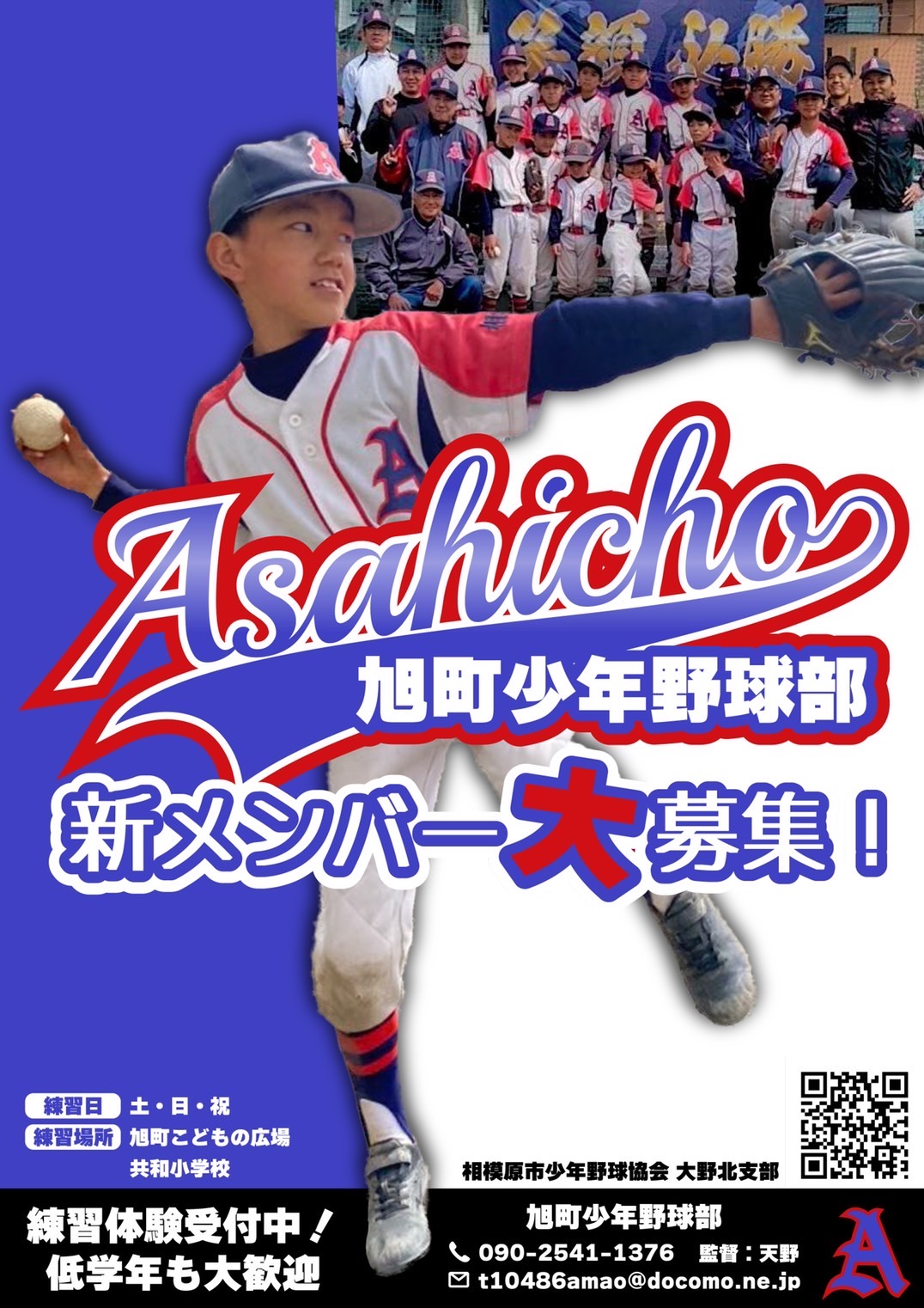 | <活動のお知らせ> 日頃から旭町少年野球部の活動に対しご理解ご協力をいただきありがとうございます。 新型コロナウィルスの感染防止対策を図り、活動を継続しています。 2022年度の活動はすべて終了しました。 一年間応援いただきまして誠にありがとうございました。 また、保護者の方々におかれましてはお当番などご協力いただきありがとうございました。 2023年度、新チームに対するお問い合わせ、体験入団に対するお問い合わせは下記までお願いします。 ※2023年度より保護者によるお当番を廃止しました。 |