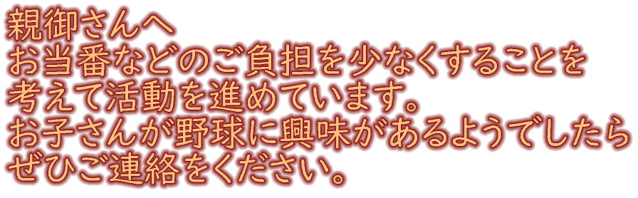 | 旭町少年野球部では保護者の皆様にできる限りご負担をかけないよう監督・指導者共々努力しています。 | |