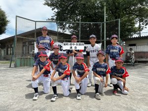 旭町少年野球部・矢部四少年野球部は、田中子ども会野球部BWとの合同チーム「旭町・田中・矢部四連合」として、所属する大野北支部で開催される前期リーグ戦に参加しました。